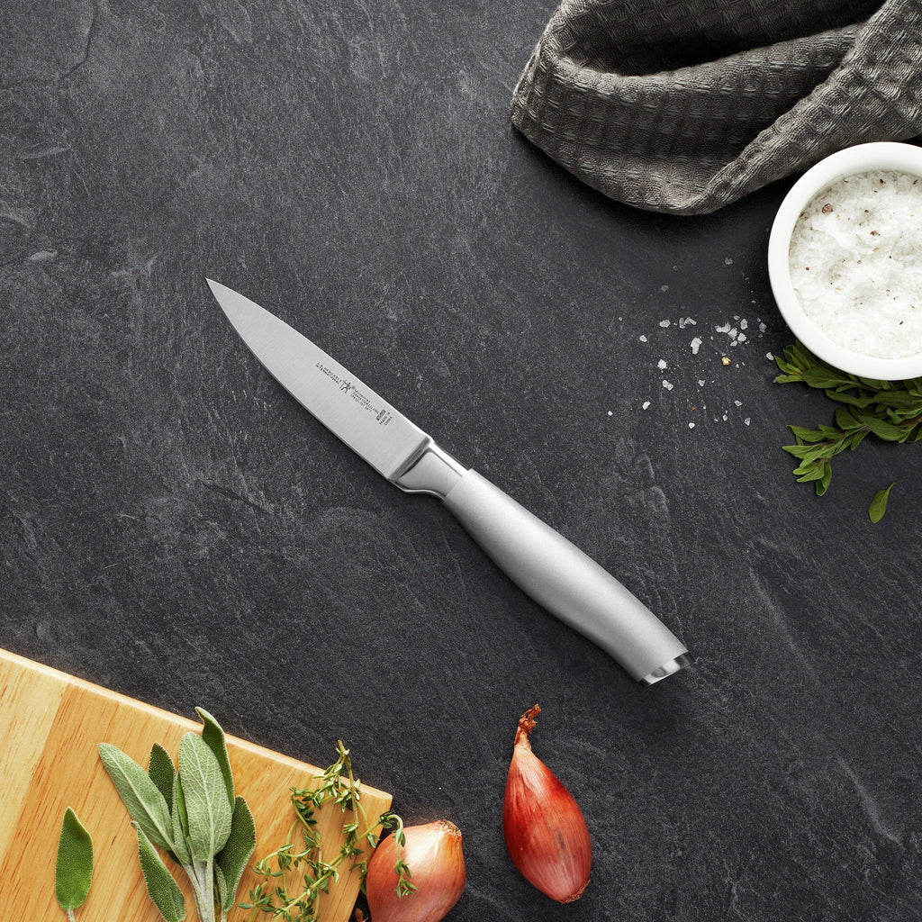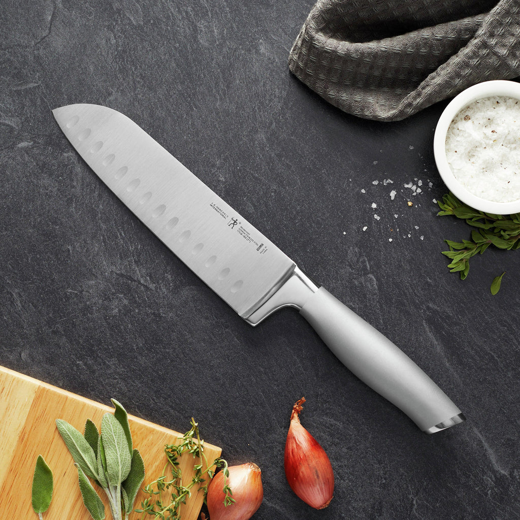 Beautiful and practical, the Modernist cutlery line features a fully forged bolster construction that seamlessly transitions from blade to handle for durability, balance, and striking design. Fabricated from high-quality German stainless steel, the satin-finished blades produce precision cuts and is honed for long-lasting sharpness. Equally ergonomic and stylish, the hollow stainless-steel handles are wonderfully lightweight. Its fingerprint-proof sandblasted texture is easy to grip and is beautifully finished with a polished, logo-embossed end. Enjoy effortless cutting and cleanup with these dishwasher-safe knives.