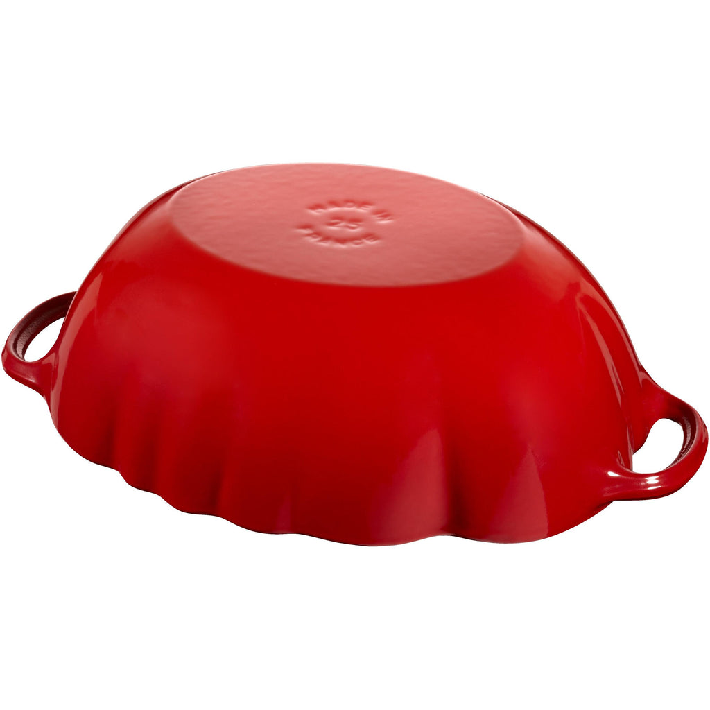 The cherry-red tomato Staub cocotte, with a 25 cm (10 in) diameter and a 2.9-liter capacity, is ideal for beginners, amateur chefs, and professionals who appreciate beautiful and unique designs. Resembling a big, juicy beefsteak tomato, it is eye-catching in both the kitchen and dining room. Made of cast iron, it is perfect for creating a variety of recipes, from savory dishes to delightful desserts.
