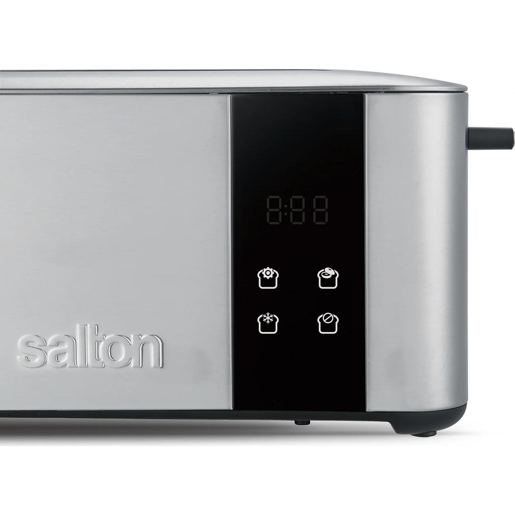 Upgrade your toasting experience with the Salton Stainless Steel Digital Countdown 2 Slice Toaster. Its cutting-edge features ensure the perfect toast every time. The innovative digital countdown timer ensures you know exactly when your toast will be ready, providing precision and convenience. Easily customize your toasting preferences with the intuitive easy-touch controls, featuring bagel, defrost, and cancel functions along with 6 shade settings. The space-saving design incorporates self-adjusting guides to center bread, guaranteeing even toasting every time. Elevate your breakfast routine with the precision and style of Salton.