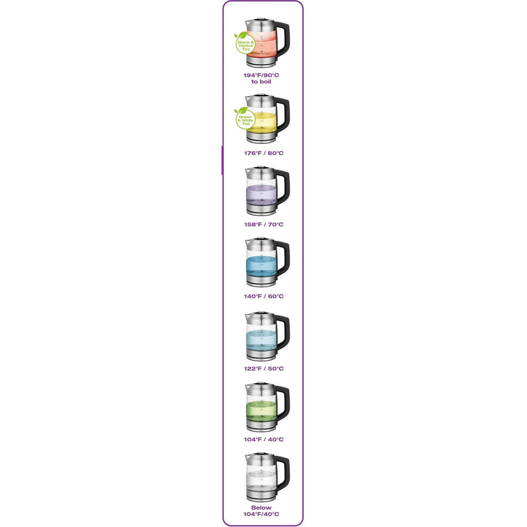 Elegant. Stylish. Sleek. This kettle can be used to boil water at the exact temperature required. BONUS Accessory included: height adjustable stainless steel tea filter basket and lid. The 7 pre-set temperatures adapt to a variety of teas; from oolong to chai, herbal to black. The 360 degree swivel base with cord storage allows you the convenience of cord-free serving and a clutter-free counter. The LED lights change as the temperature rises to indicate the temperature of water the kettle has reached. The perfect cup of tea is at the press of a button! Read Less