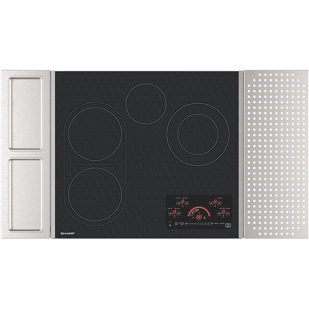 The Sharp® 24-inch SCR2442FB Electric Cooktop is a powerful, beautiful addition to your dream kitchen. The black mirror finish of the glass surface is a perfect match for modern appliances while precise temperature control with touch-glass controls for each of the four cooking zones provide convenience you can count on. The included magnetic stainless-steel side accessories are dishwasher safe and a convenient place to rest spoons, ladles, and spatulas as well as pots and pans. The SCR2442FB features a variable-sized zone with Double Heater capability to handle larger size pots and pans efficiently. Dual elements allow you to use multiple pan sizes, while the Bridge Heater synchronizes the two left cooking zones to accommodate larger cookware, such as griddles, grill pans, and custom cookware for your most elaborate entertaining. There’s even a kitchen timer for each cooking zone. And without an open flame or radiant coil, spills and splatters are less likely to burn and a breeze to clean up. The Speed Boil function of the SCR2442FB is perfect for those times when you just need that pasta water to boil. The Sharp 24-inch SCR2442FB Electric Cooktop includes practical safety features, including the control lock to prevent unwanted, or accidental use. The Hot Surface Light indicator lets you know, at a glance, if each of the cooking surfaces is on or still hot with residual heat. Powerful and efficient, fast and flexible, the beautiful Sharp SCR2442FB Electric Cooktop with Black Mirror Finish is certainly Simply Better Living.